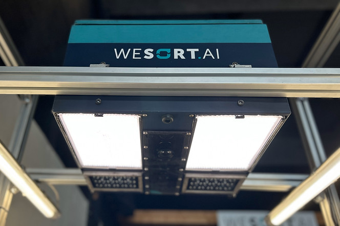 The Vision.Insights and a pneumatic sorting line plus conveyor belt and bonnet make up the complete Vision.Sort from WeSort.AI